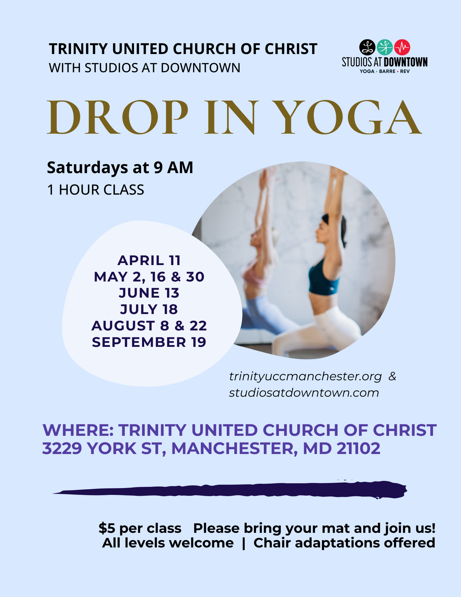 April 11 – September 19: Drop in yoga is back at Trinity for the Spring/Summer – see attached schedule. $5 donation requested per class. Please bring your mat and join us! All levels are welcome and chair adaptations are offered. Offered in partnership with Studios at Downtown in Westminster.